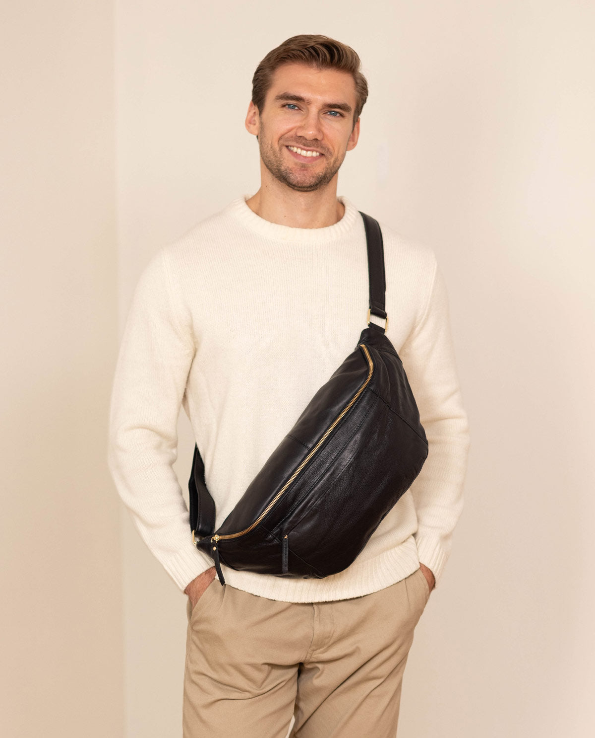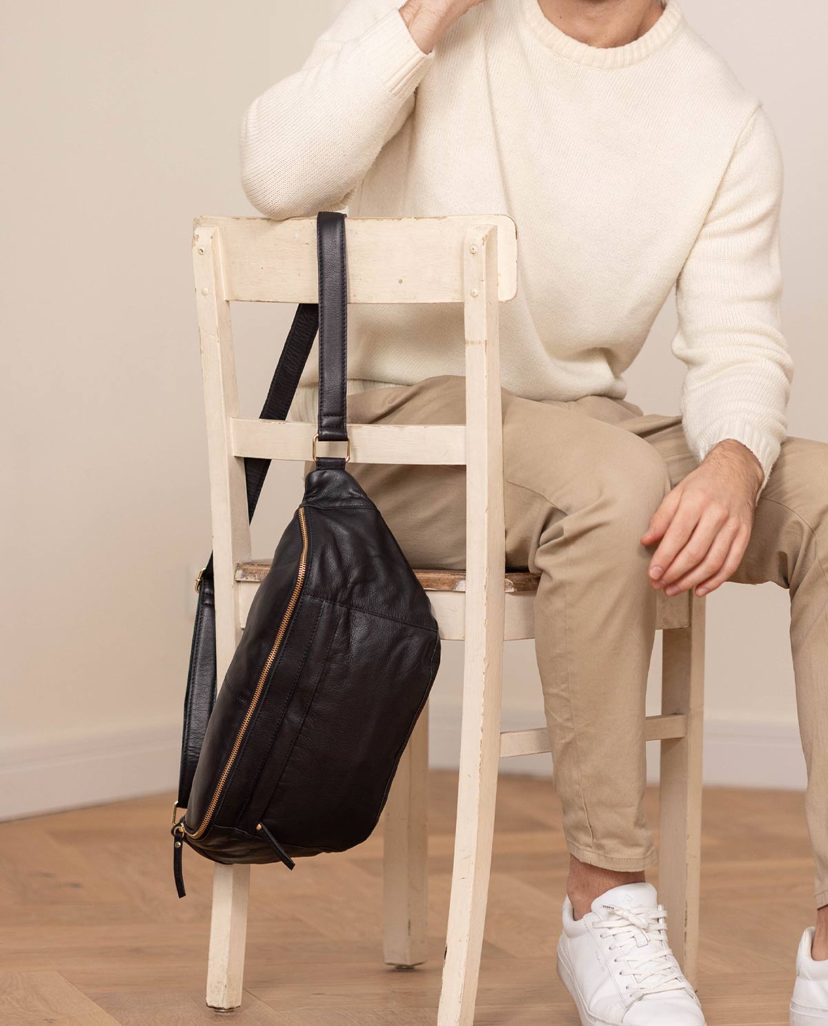 This robust and spacious cowhide leather bum bag-style bag combines the advantages of a compact backpack with a trendy, casual-cool bum bag, so you’ll always look good with this soft leather bag with gold zips. “Esben” can accompany you anywhere, so you can take everything you need with you while still looking cool. “Esben” has more than enough space for your phone, keys, purse, pocket organiser, pencil case, and more!