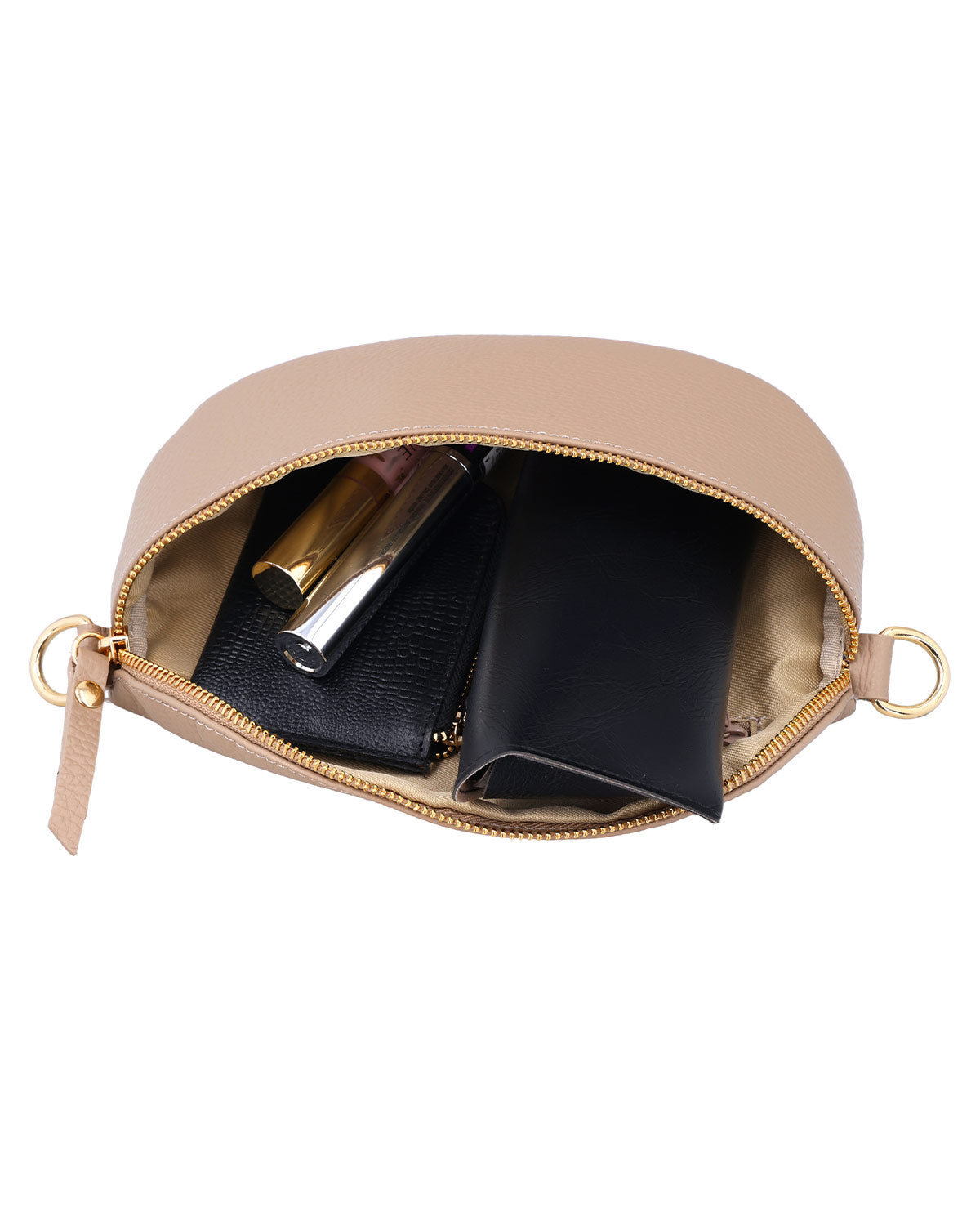 The "Brinja" shoulder bag impresses with its elegant design and high functionality. With the distinctive, semi-circular silhouette and the complete zipper along the top edge, it not only offers ample space for your essentials but also security for all your personal items. The high-quality leather gives it a noble appearance that perfectly fits into your modern everyday life. Inside, you will also find the finely embossed "Made in Italy" logo, which impressively underscores the origin and quality of this bag.