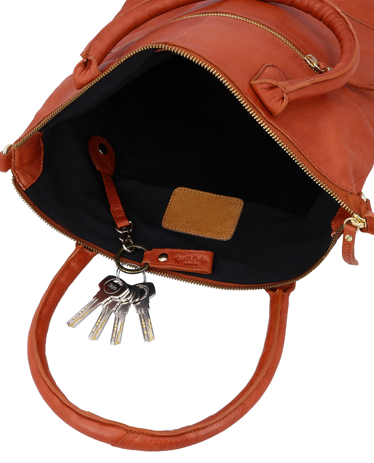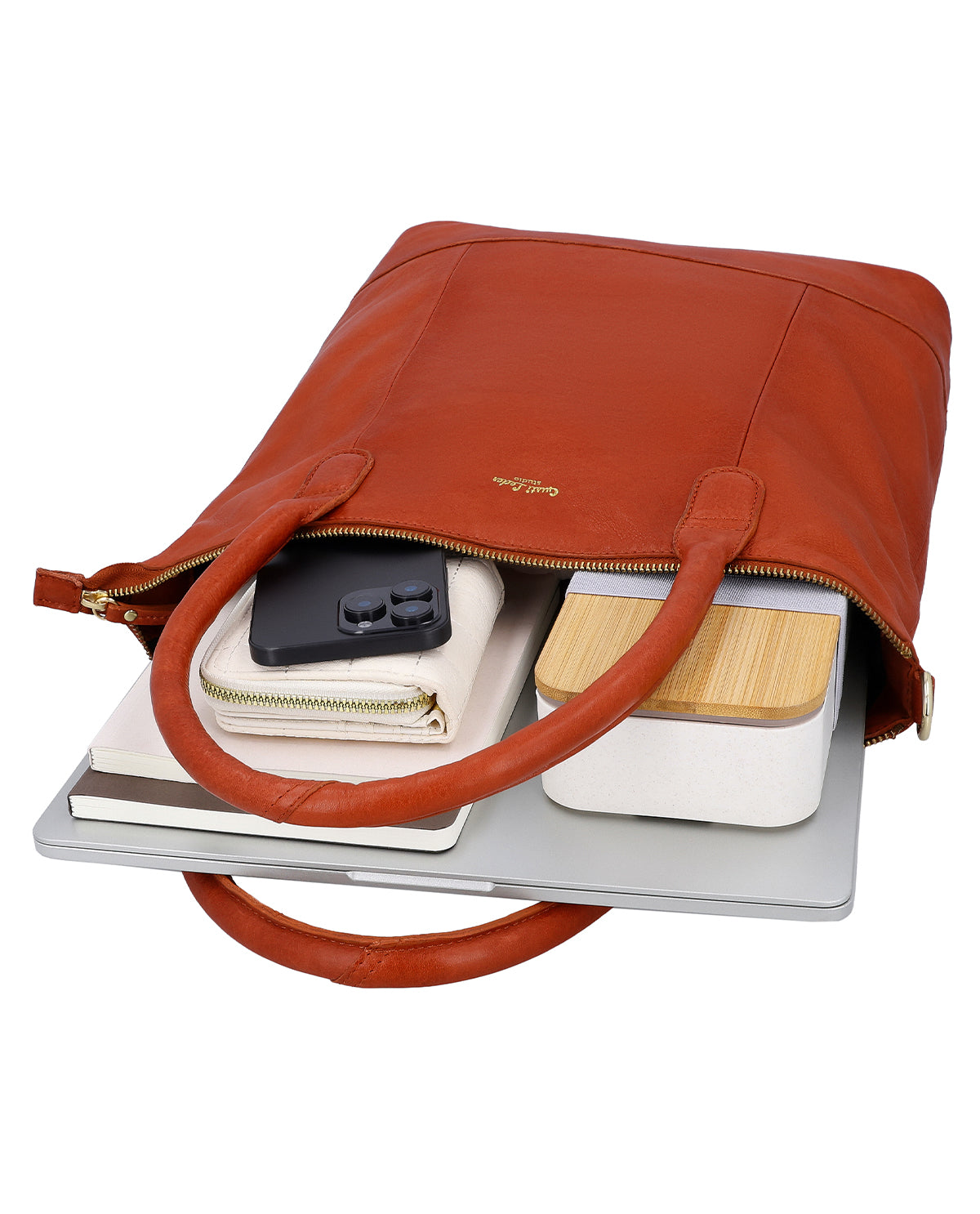Made from high-quality tanned cowhide, this shoulder bag impresses with its sheer size and offers you versatility at the highest level. The extra-large interior compartment of "Mia" has a capacity of 10 liters and thus provides enough space for everything. Here you can fit your 15-inch notebook, wallet, small umbrella, various notebooks, keys, and pencil case. Additionally, the large opening offers enough storage space for a spontaneous purchase. Additionally, you have a side pocket at the back where you can store items on the spot, like headphones or keys.