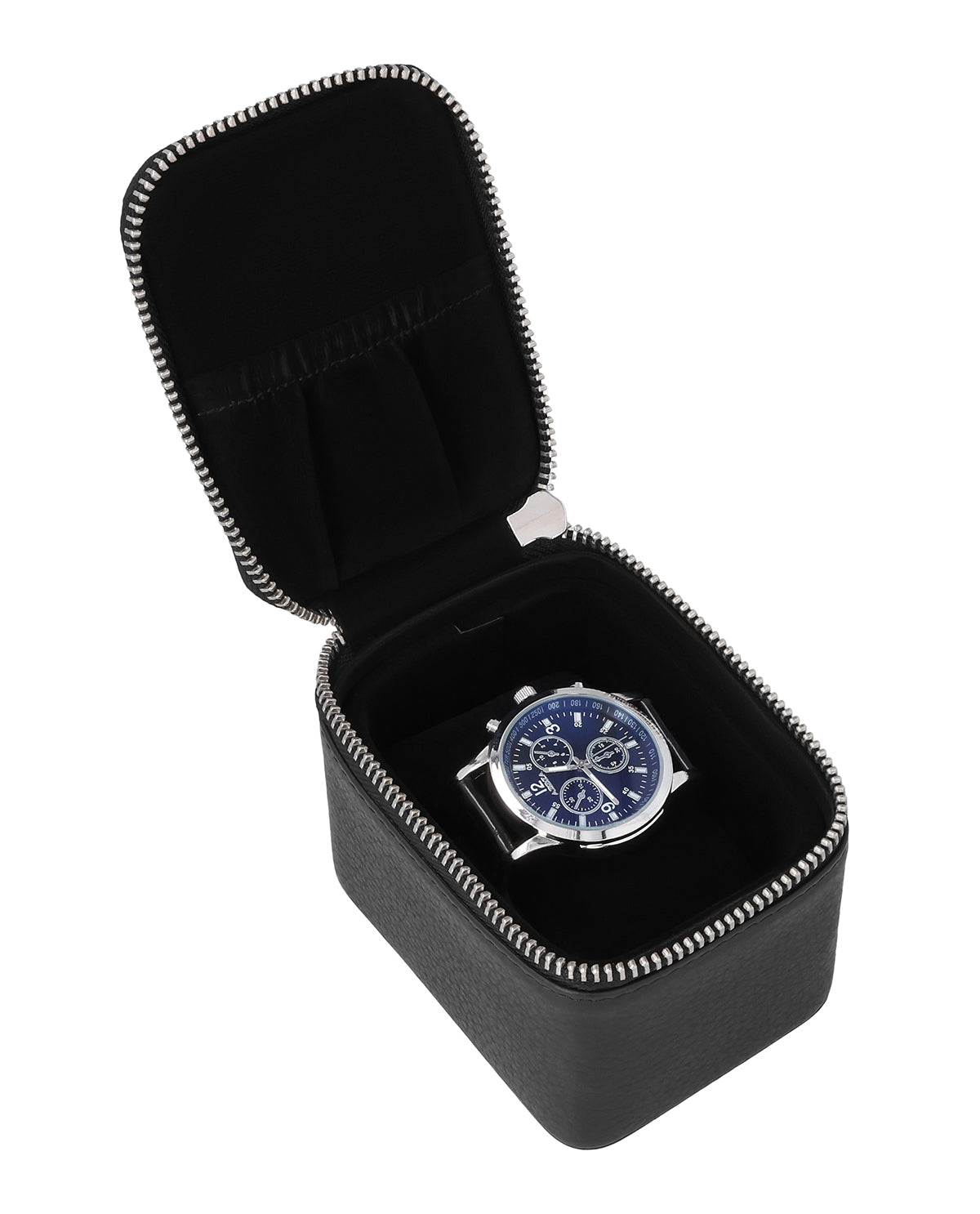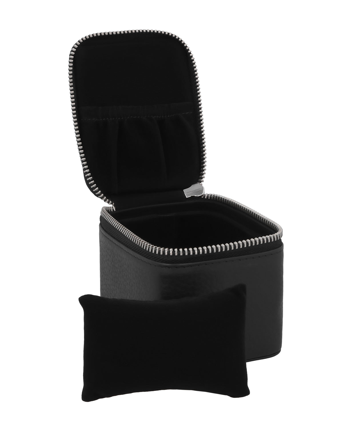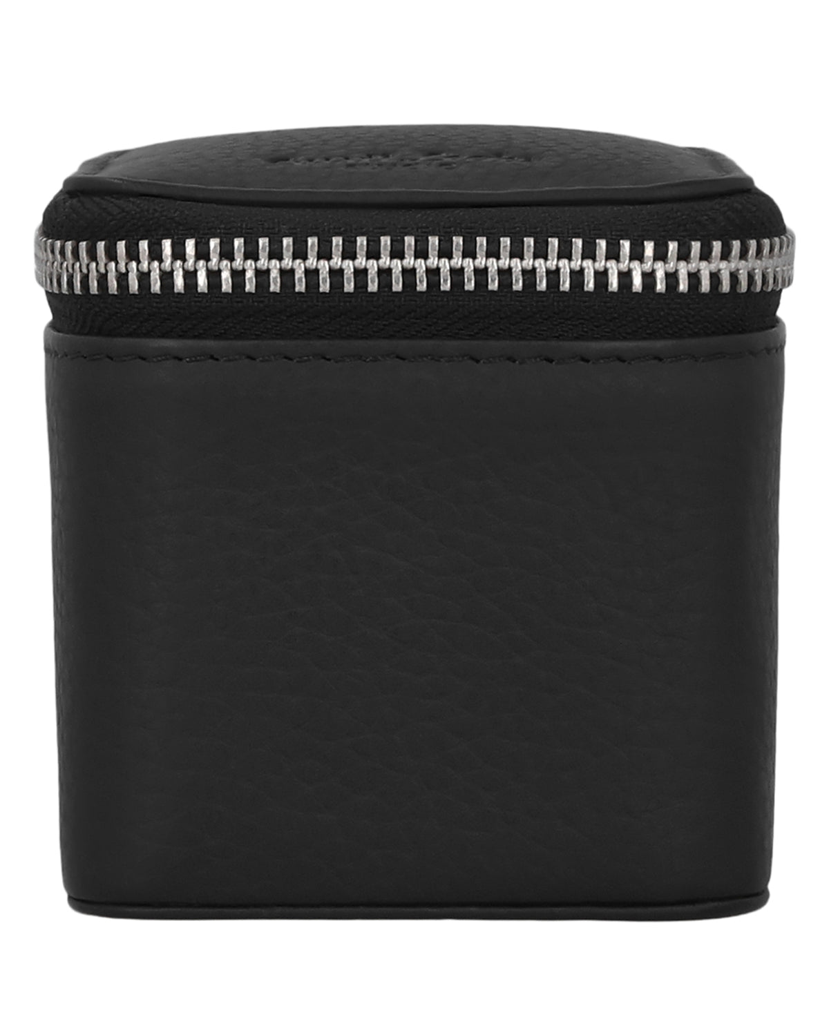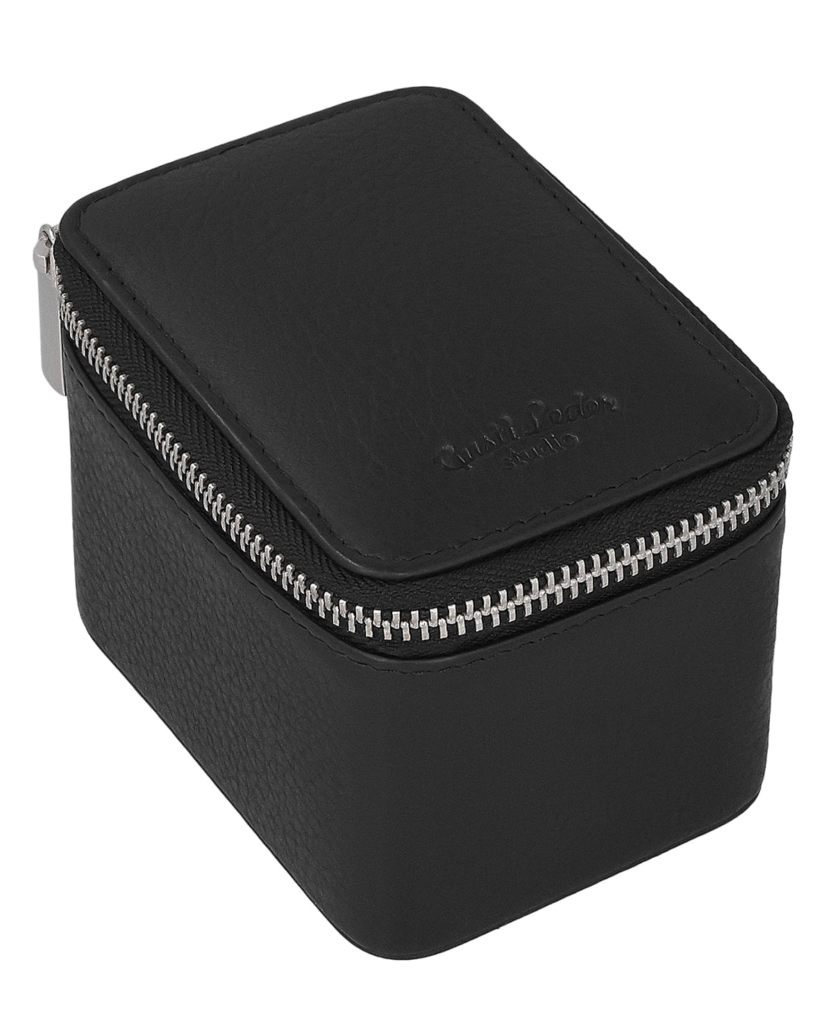 The "Hali" watch box is a black leather case for men that stores your watch stylishly and securely. The clean, masculine design is both minimalist and high-quality. A metal zipper closes the box securely and protects the contents when you are on the go or traveling. The Gusti logo on the top emphasizes the characteristic brand image without being obtrusive.