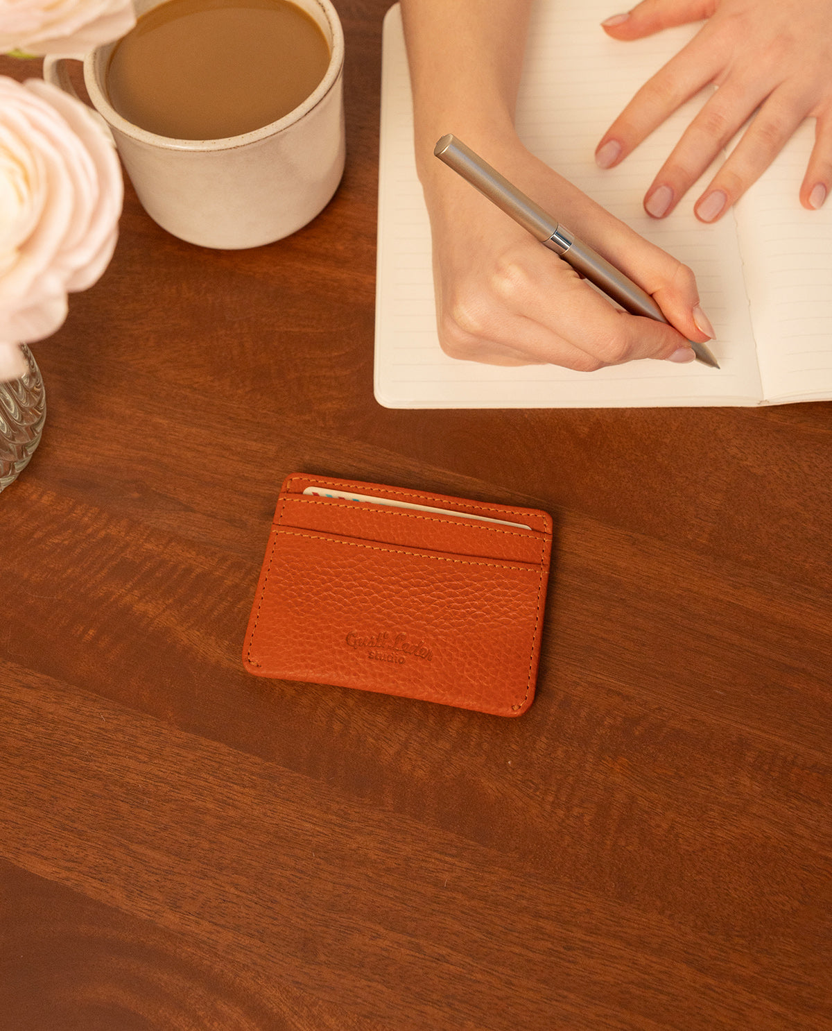 The "Qani" card holder is the perfect choice for anyone who values organization and elegance. Made from high-quality orange leather, it impresses with its compact size and elegant design. The noble color and fine craftsmanship make it a stylish accessory that is not only functional but also a real eye-catcher. With this card holder, you always have everything important with you – and in the best quality.