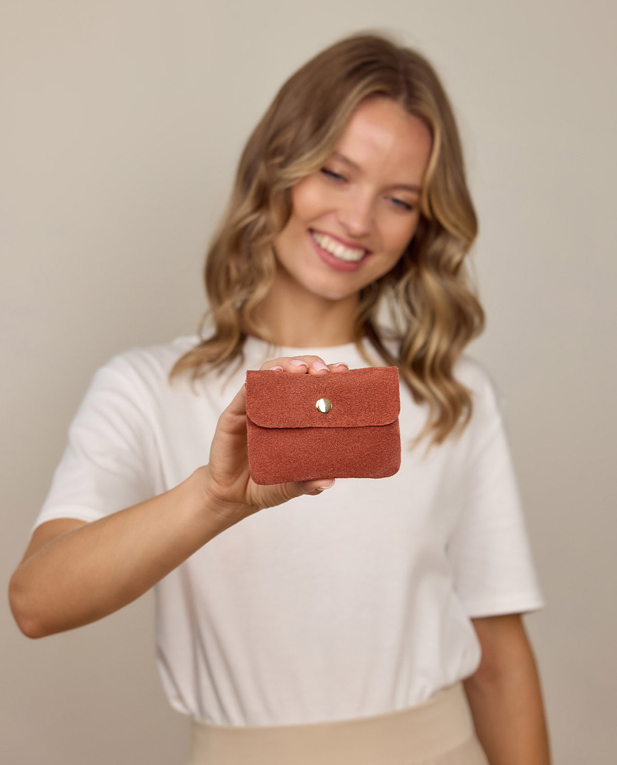The "Maite" storage bag is the perfect solution for stylishly storing your small but important items. Made from high-quality leather with a soft suede look, it offers not only an elegant appearance but also a pleasant feel. Its practical snap closure ensures that your items are securely stored, while the main compartment with zipper provides additional protection for your valuables. The compact size makes it particularly easy to store the "Maite" in a bag or even in your pocket – ideal for everyday use.