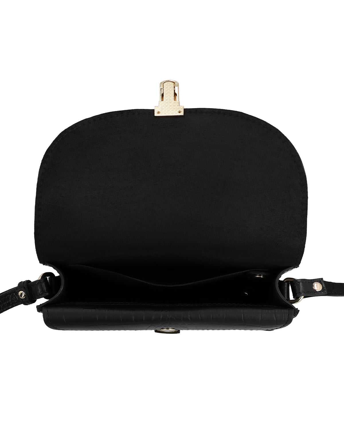 Are you looking for THE crossbody bag? One that can be used day and night? A bag that levels up any outfit? “Sandy” to the rescue! Her slim size makes her the perfect shoulder bag. The crocodile-skin look makes this black cowhide leather bag stand out, no matter where you are. She’ll win you over with a pop of colour and her subtle gold appliqué.