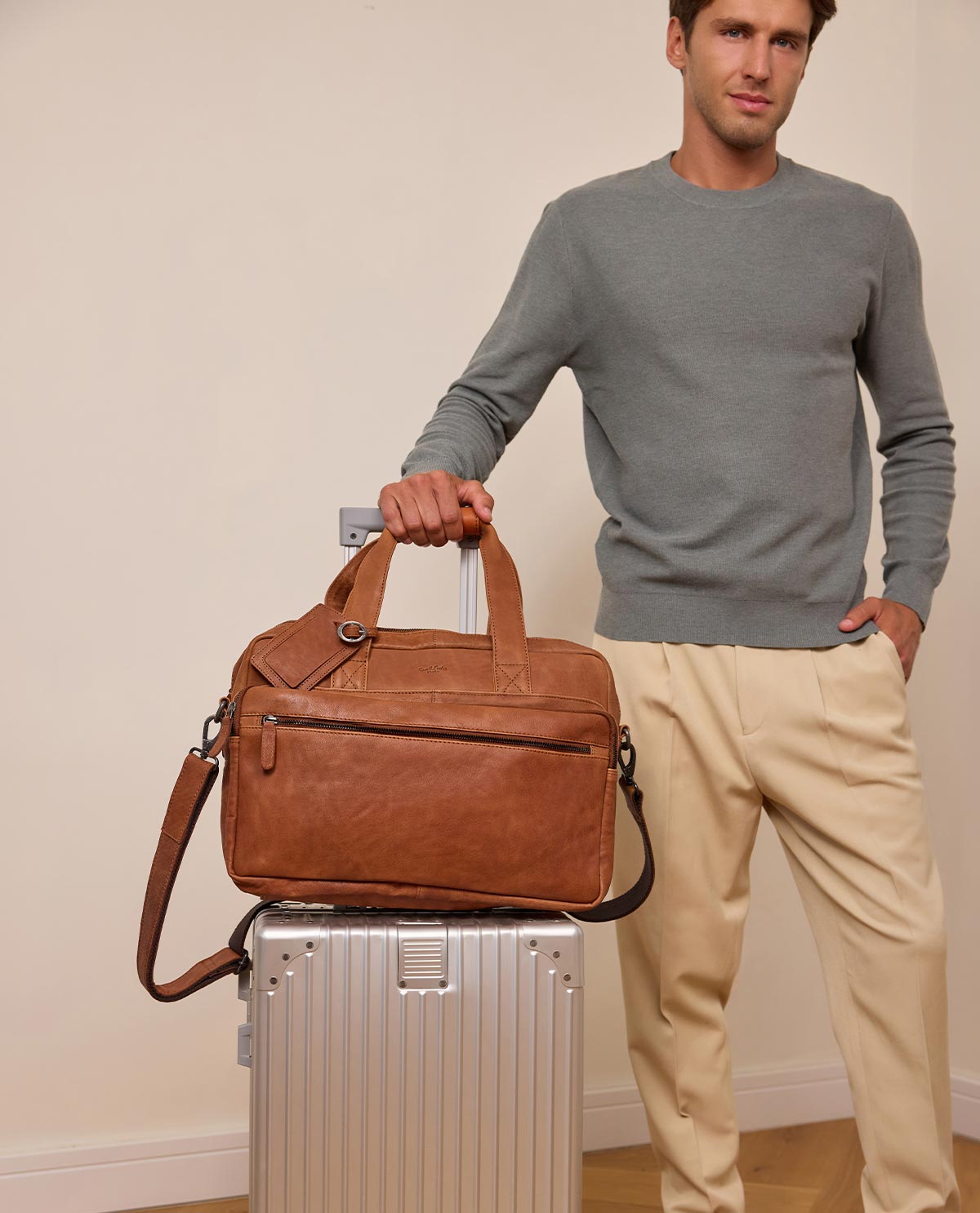 Die "Alvaro" ist die perfekte Businesstasche für alle, die Eleganz mit Funktionalität verbinden möchten. Gefertigt aus hochwertigem braunen Leder, verleiht sie Deinem Look eine zeitlose und professionelle Note. Mit durchdachtem Design und großzügigem Stauraum ist sie ideal als Arbeitstasche für Meetings, Reisen oder den Büroalltag. Dank der doppelten Reißverschlussfächer behältst Du stets den Überblick über Deine Dokumente und Arbeitsutensilien.
