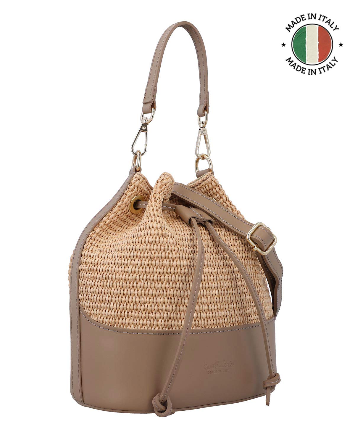 Die "Nuria" Beuteltasche vereint zeitlose Eleganz mit durchdachter Funktionalität. Ihr fein gewobenes Raffia-Material verleiht ihr eine natürliche Leichtigkeit: Raffia wird aus den Fasern einer Palmenart gewonnen, ist besonders robust und gleichzeitig angenehm flexibel – ideal für eine Bag, die Dich stilvoll durch den Alltag begleitet. Der glatte Lederboden sowie die Lederdetails sorgen für zusätzliche Stabilität und Langlebigkeit. Das außen eingeprägte „Made in Italy“-Logo (nicht vergoldet) setzt einen dezenten, hochwertigen Akzent und unterstreicht den modernen Vintage-Charme der Tasche.