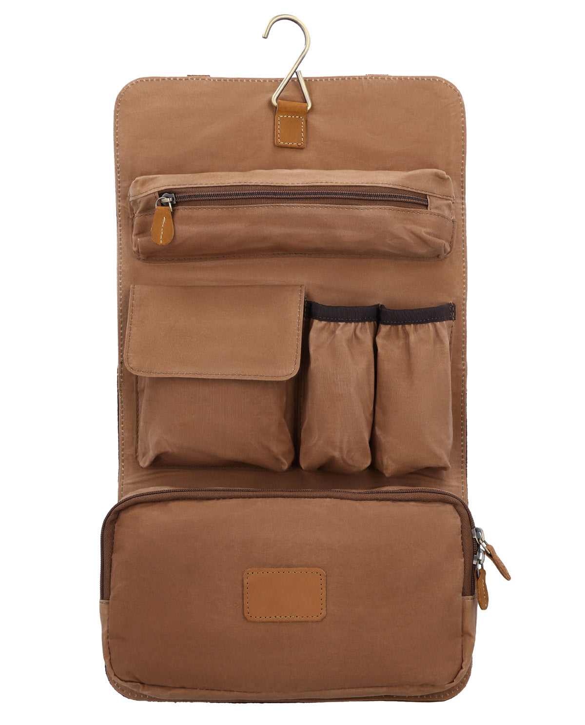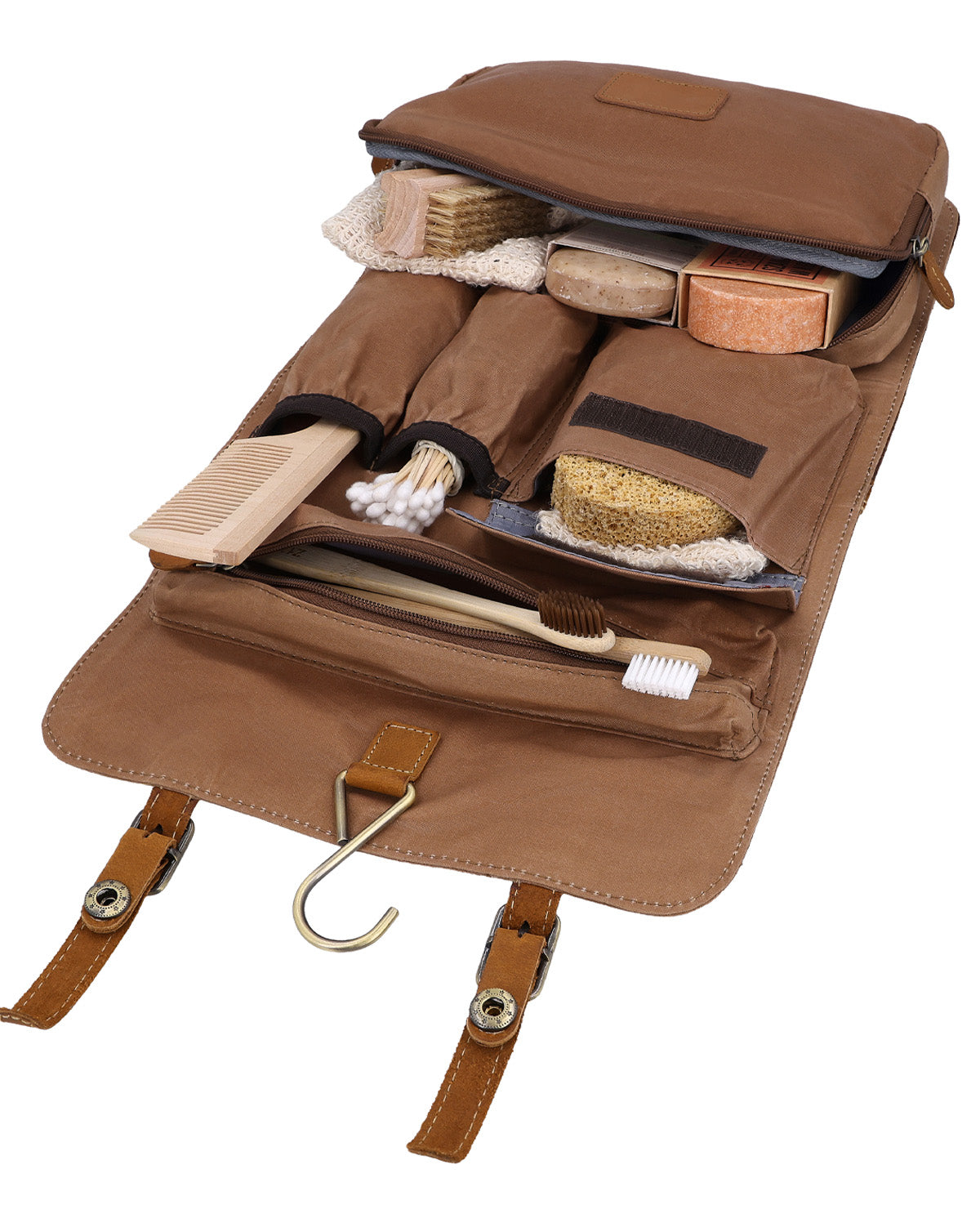 Einmal aufgeklappt kommt dann das große Staunen. Bei "Rodney" wurde wirklich an alles gedacht: So kommt er aus einem hochwertigen Materialmix aus Canvas Webstoff und Büffelleder daher. Innen hat er diverse Fächer in verschiedenen Größen und Formaten für deine Zahnbürste, Shampoos, Bürste, Rasierzubehör, Kosmetik uvm.Dabei verhindert der Innenstoff aus wasserfestem Polycotton kleine Malheure durch ausgelaufene Shampooflaschen. Der stabile Metallhaken erlaubt darüber hinaus ein kinderleichtes Aufhängen von "Rodney" an deiner Wand. Die verstellbaren Schnallen und Druckknöpfe vollenden das Design. Kulturbeutel "Rodney" - ein echter Sorglosmacher eben!