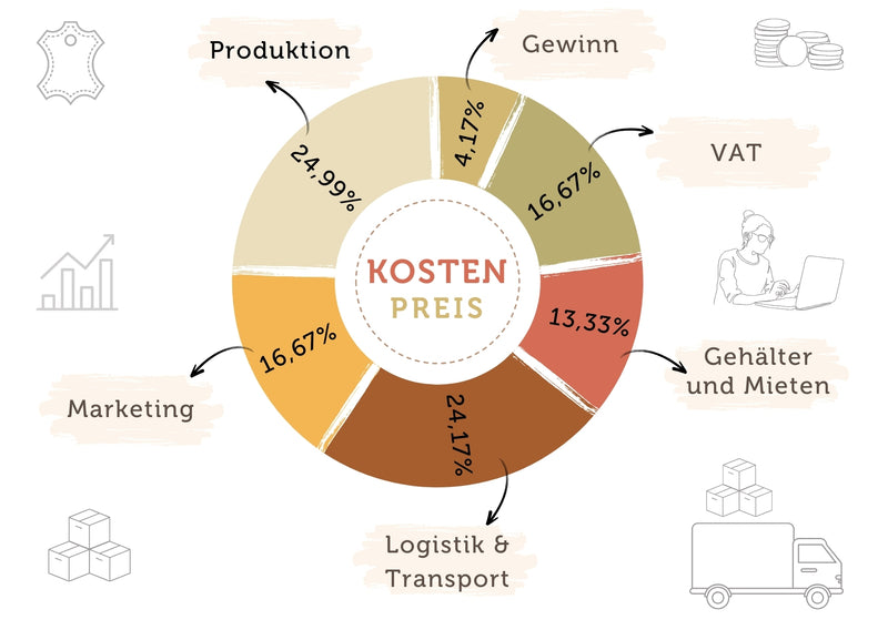 Unsere Preispolitik ist äußerst transparent. Wir möchten Vertrauen zu unseren Kunden aufbauen und ihnen das Gefühl geben, dass sie selbst entscheiden können, indem wir sie über unsere Preispolitik informieren. Vertrauen ist die Grundlage jeder starken Beziehung und TRANSPARENZ trägt dazu bei, dieses Vertrauen zu schaffen. Wie wir die Preise für unsere Produkte festlegen, haben wir im obigen Modell dargelegt. Bei der Berechnung unserer Preise berücksichtigen wir verschiedene Faktoren, darunter: Gewinnsteuer, Gewinn, Miete und Löhne, Marketing, Transport und Logistik sowie Herstellung.