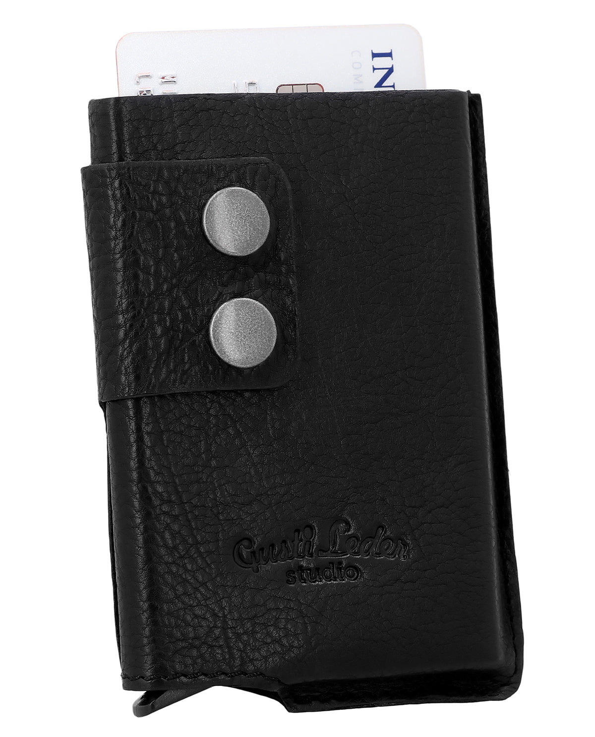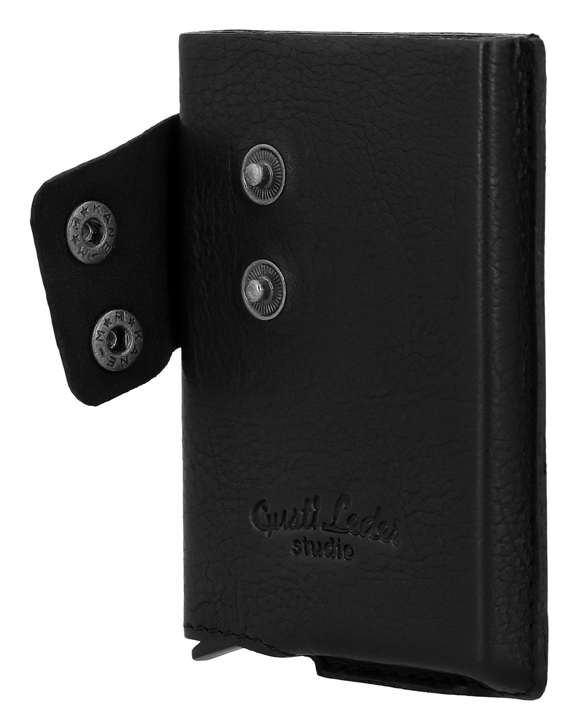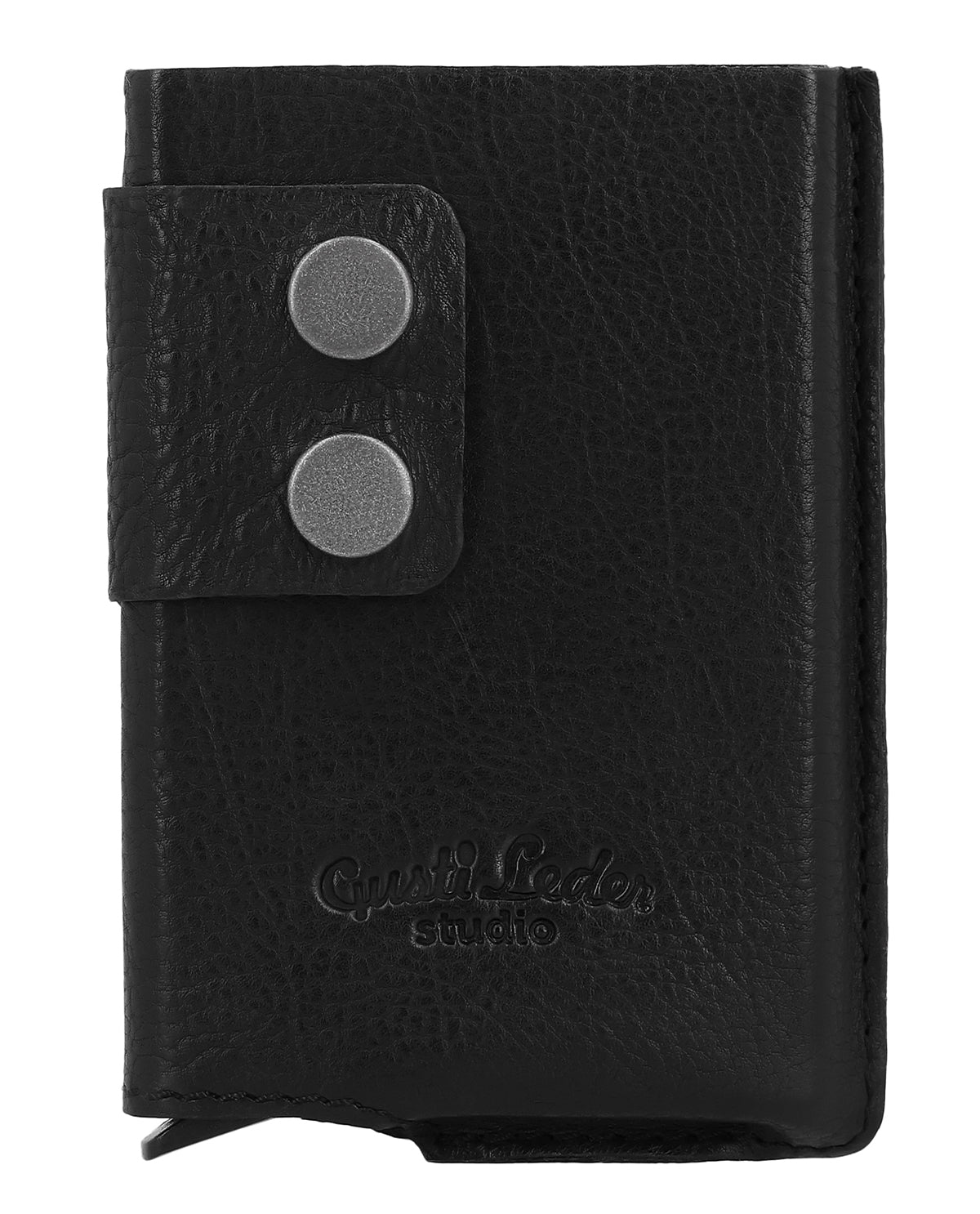 Das schwarze Portemonnaie „Tilo“ ist eine Geldbörse für Herren, die Sicherheit und klare Struktur miteinander verbindet. Zwei Druckknopfverschlüsse sorgen für festen Halt und ein sicheres Verschließen im Alltag. Der integrierte automatische Pop-up-Mechanismus bringt Deine Karten auf Knopfdruck übersichtlich nach oben und ermöglicht schnellen Zugriff. „Tilo“ wirkt reduziert, funktional und passt mühelos in jede Tasche.
