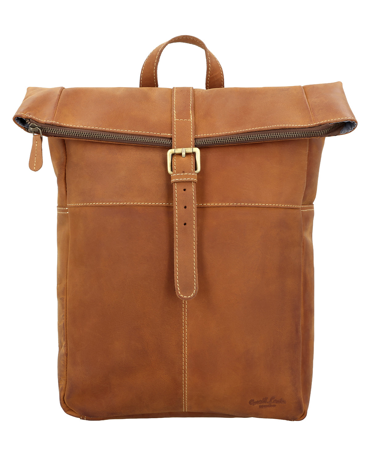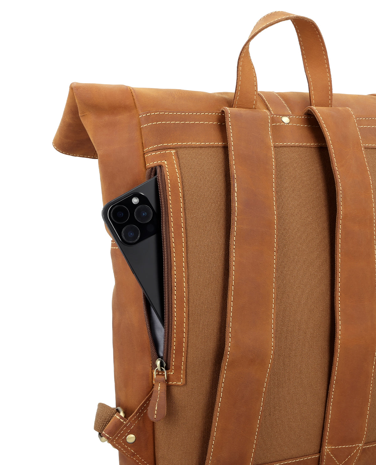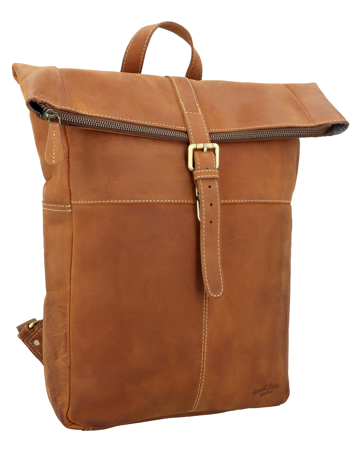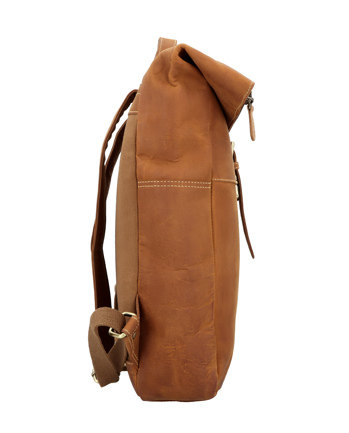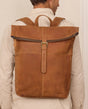 “Henning” is a medium-sized roll top backpack made of sturdy, camel brown goatskin leather that’ll help you navigate the big city maze or narrow metro lines with ease thanks to its slim cut. Its well-thought-out layout has more than enough space in the large main compartment for your A4 folders, 15” notebook, books and a large water bottle, there’s an additional zip pocket inside so that you can organise your things and find them with ease. The bright inner fabric is made of water-resistant polycotton which protects your backpack from moisture and marks, so you don’t need to worry if you have any small mishaps. The zipped pocket on the side has plenty of space for all of your belongings and the padded back section and the inner side of the wide shoulder straps are covered in brown canvas to offer you extra comfort.