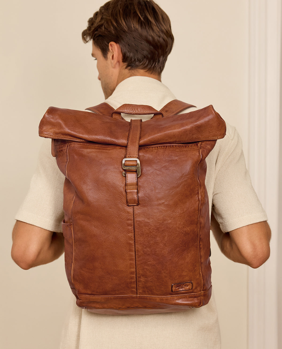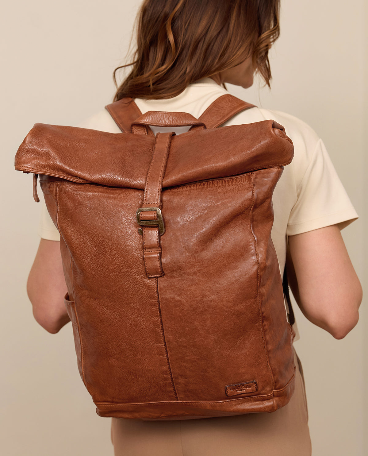 Our “Bendik” rolltop backpack is the perfect companion, no matter if you’re going to school, uni or work. He’ll win you over with his flexibility, comfort, and space. This sturdy, classic daypack made of brown leather stands out from the crowd with its trendy rolltop—a look that you just can’t ignore at the moment.