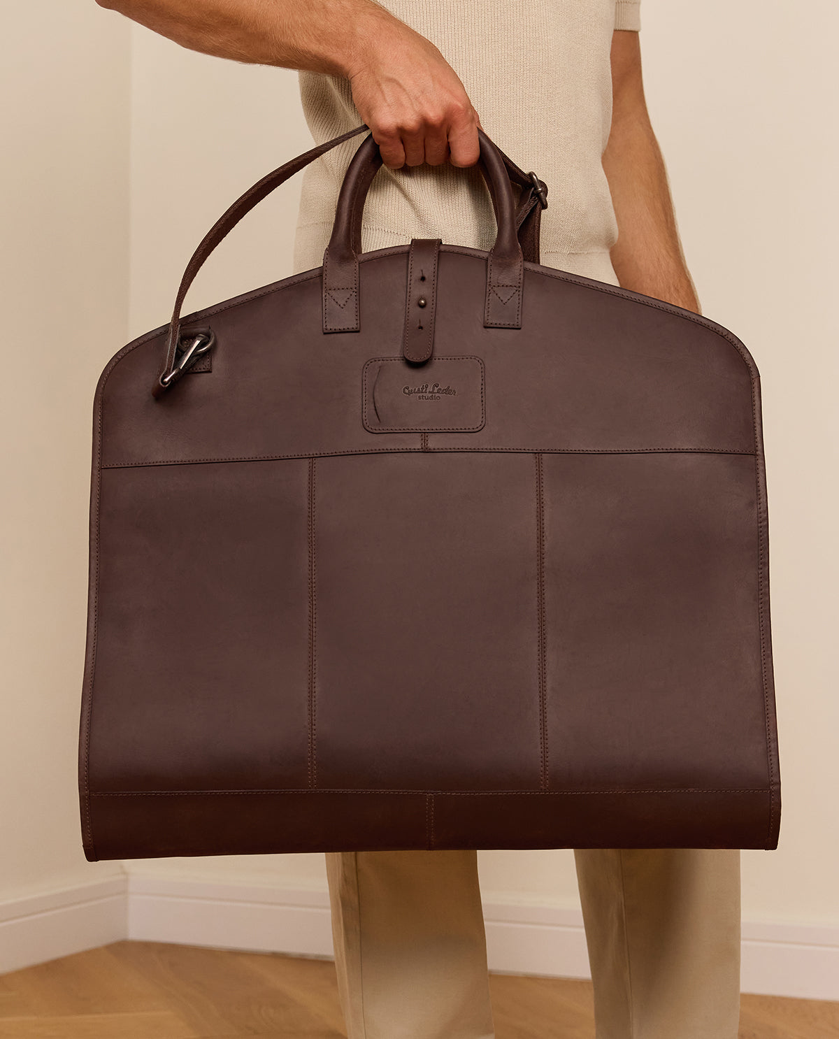 With our high-quality leather bag "Sloan" in charming vintage style, every trip becomes a stylish experience. Lightweight, handy, and thoughtfully designed, it is perfect as a companion on flights or business trips. "Sloan" offers ample space for several suits or garments, which you can conveniently leave hanging on the hanger. Two separate compartments for shoes ensure that your outfits always remain clean and separate. A long zipper allows for easy opening and filling of the bag, while sturdy carrying handles make transport particularly pleasant. Thanks to the integrated hanging hook, you can hang the bag directly in the hotel or closet - practical and space-saving at the same time. The classic retro design, rounded off by the embossed Gusti Leather logo, makes "Sloan" a timeless eye-catcher. Additionally, you can personalize it with an individual engraving - for an extra touch of individuality.