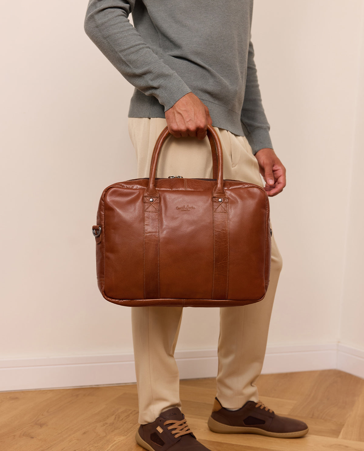 We're proud to present... “Fynn”, your new favourite leather bag. Take him to uni, the office, or the shops, our striking bag “Fynn” is everything you could want in a briefcase. He has a 15-inch laptop compartment, and pockets for your notepads and books, as well as your charger, pencil case, wallet, phone, water bottle, and keys. Take everything you need with you on your next business trip. Keep your belongings safe but easy to find thanks to the zip on the bag. Carry this briefcase in your hand or over your shoulder like a satchel using the detachable, adjustable strap. “Fynn” comes with a helpful sleeve on the back so you can slide this messenger bag onto the top of your suitcase.