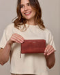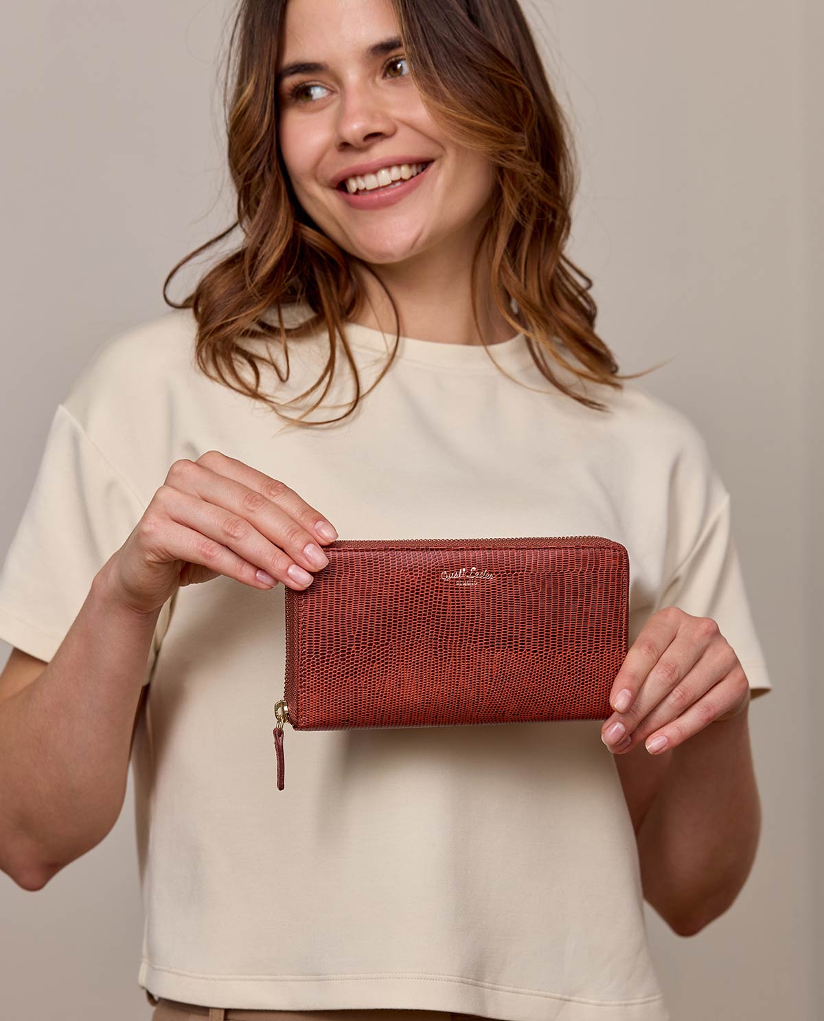 With "Cara" you have everything important stored stylishly and securely. This noble wallet made of high-quality brown leather combines timeless design with thoughtful functionality. Thanks to the multiple compartments, it offers ample space for your numerous cards, bills, and receipts. The well-thought-out interior ensures that you always have the perfect overview, while the soft leather feels pleasant in the hand. Whether in everyday life or on special occasions – "Cara" is the ideal companion for style-conscious women who equally appreciate elegance and order.