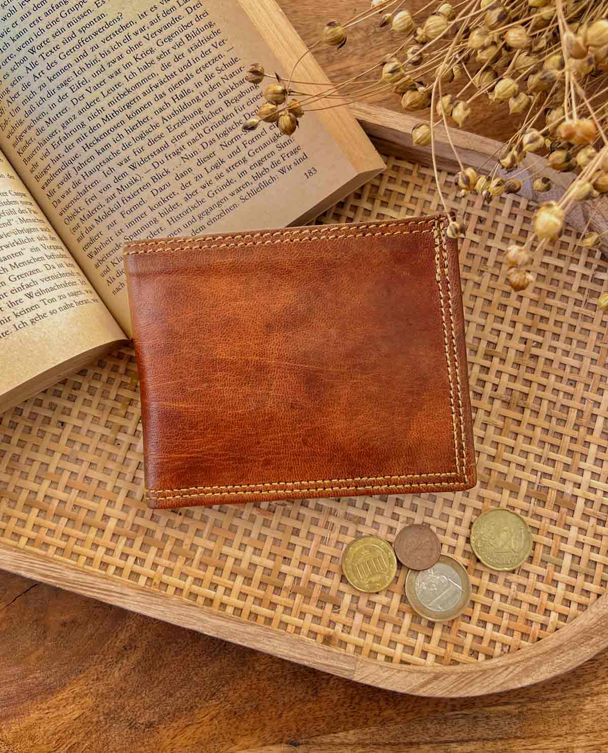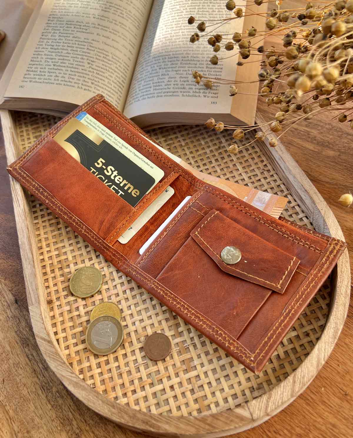 Our wallet “Joey” is simply divine. This soft and flexible goatskin leather wallet will win you over with its simple vintage look. “Joey's” design is completed by contrast stitching which adds an elegant touch to this billfold wallet. Simply fold this wallet up to keep your cash safe inside. There are three card slots in this wallet and two additional pockets for extra cards. Keep your change safe in the small press button secured pocket and store your cash in the long note pocket. “Joey” comes in a handy size so it fits in any bag or pocket.