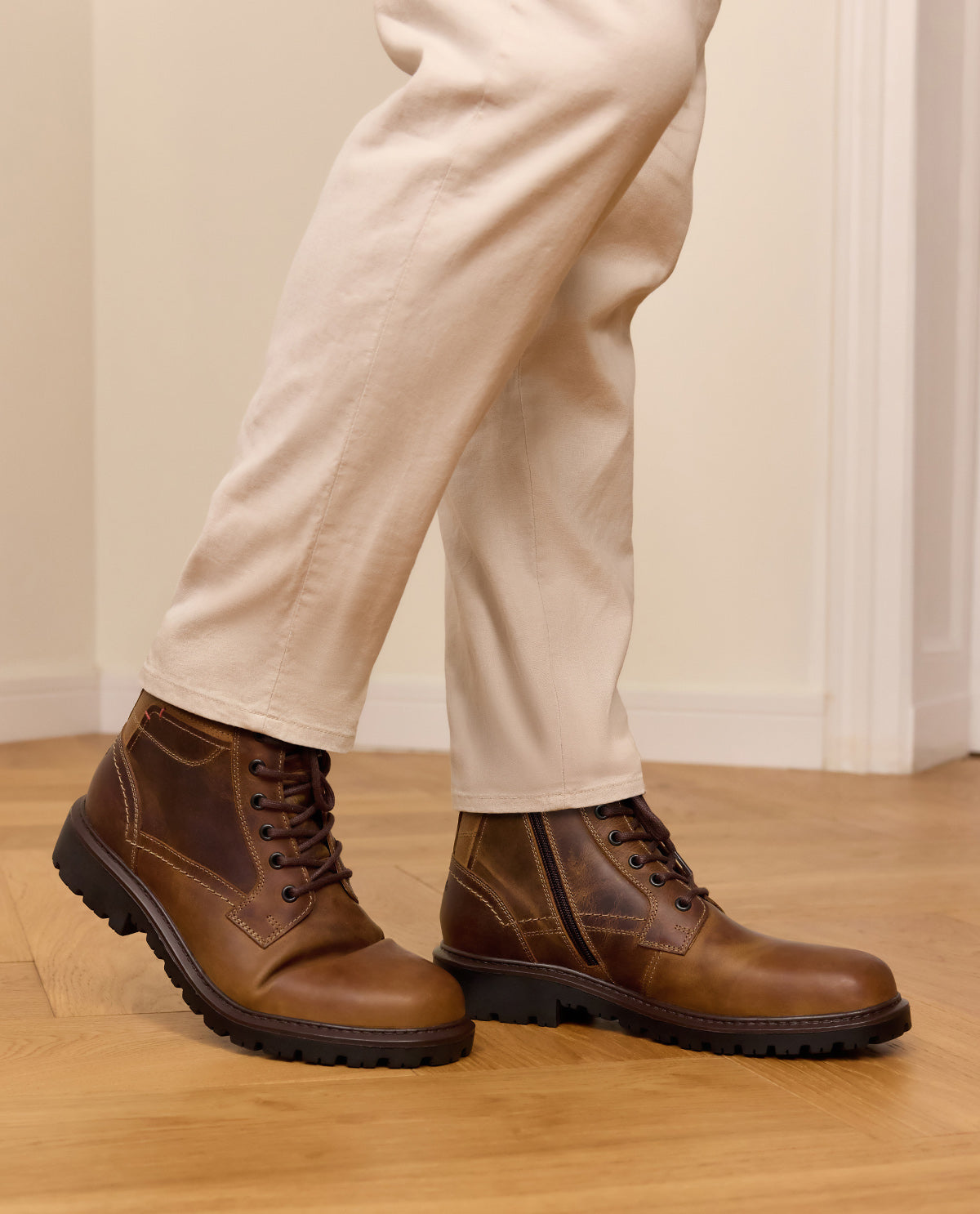 With "Oberon", you choose a pair of leather shoes that combines classic elegance with modern sophistication. Made from high-quality cowhide leather, these shoes impress with their smooth texture, durability, and elegant shine that suits any occasion. The classic lace-up design with eyelets allows for a personalized fit, while the side zipper enables quick on and off – a practical detail that combines comfort and functionality. The fine orange stitching at the ankle provides a stylish accent that subtly enhances the simple design.