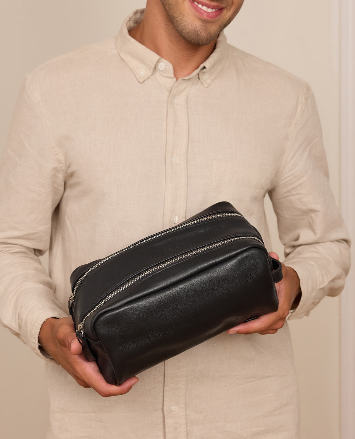 Our high-quality processed cowhide leather sponge bag “Finja” is the perfect place to keep your hygiene products safe when you're on the move. There's space inside for your deodorant, shampoo, conditioner, toothbrush, toothpaste, and much more. The spacious main compartment is lined with water-resistant polycotton, so you don't need to worry about any spillages when you're on the go. Her look is completed by the chic zip, which doubles up as a handle. You can keep everything safely stored at all times.