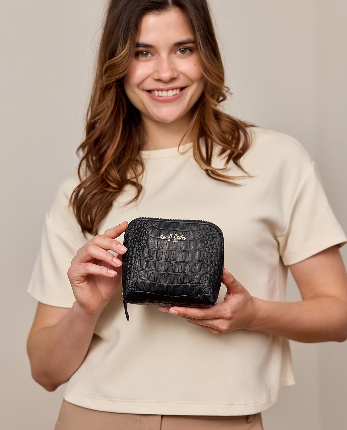 Do you often lose track of things in your bag and spend ages looking for your mascara or other small items? Then "Leo" is just right for you! This beautiful little pouch ensures order in the endless depths of your bag and impresses with its stylish design. Made from high-quality black cowhide leather, it exudes a noble elegance that effortlessly fits into your everyday life. The all-around accent zipper emphasizes the classic look and makes "Leo" a stylish companion – discreet but still an eye-catcher.