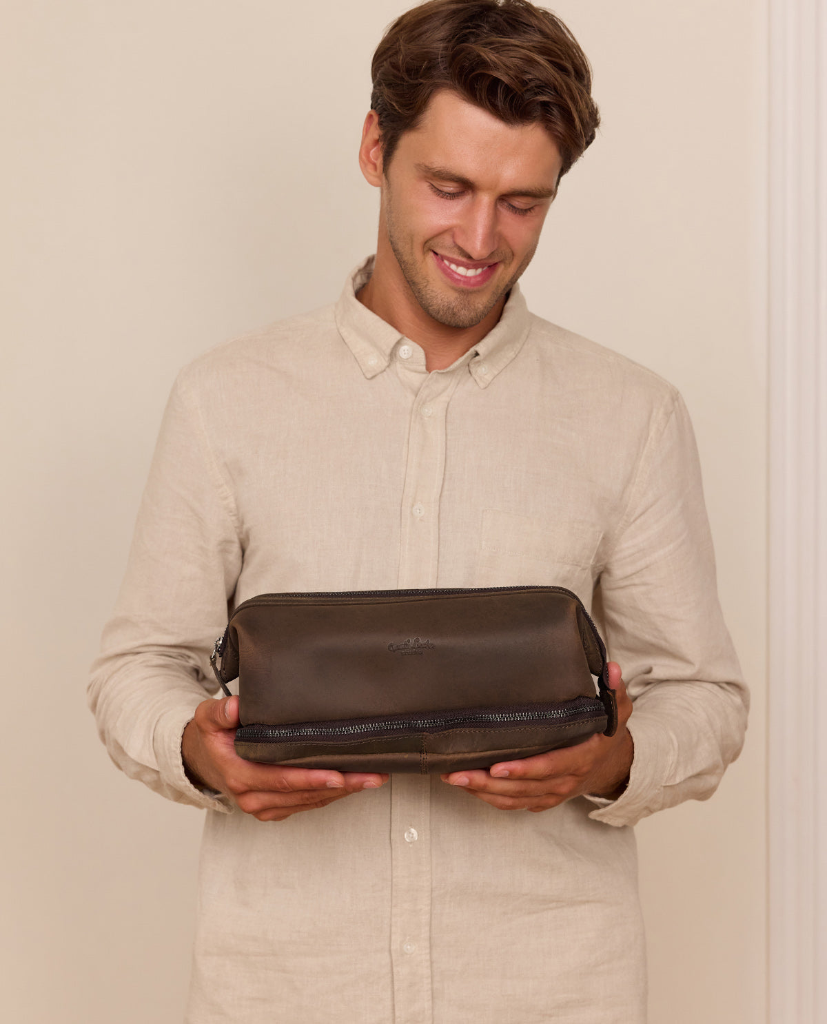 Our toiletry bag "Quinn" helps you organise your travel essentials. This high-quality leather washbag combines timeless design with functional features. Use it on a weekend getaway or a longer trip and keep your toiletries are stored stylishly and securely in "Quinn".