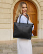 This timelessly trendy handbag is made of chic black leather and can be used on any occasion. It's the perfect companion for the office and in your leisure time, thanks to its generous volume and versatile storage for documents, books, and folders. You'll turn heads at university and on nights out with this stylish bag. It's great for university students, teachers, and professionals. A stylish eye-catcher in a trendy retro style. Your belongings are kept safe by a practical and sturdy zip. The large handles mean you can still move easily with “Greta” over your shoulder. There are multiple pockets inside where you can keep your belongings safe when you're on the go.