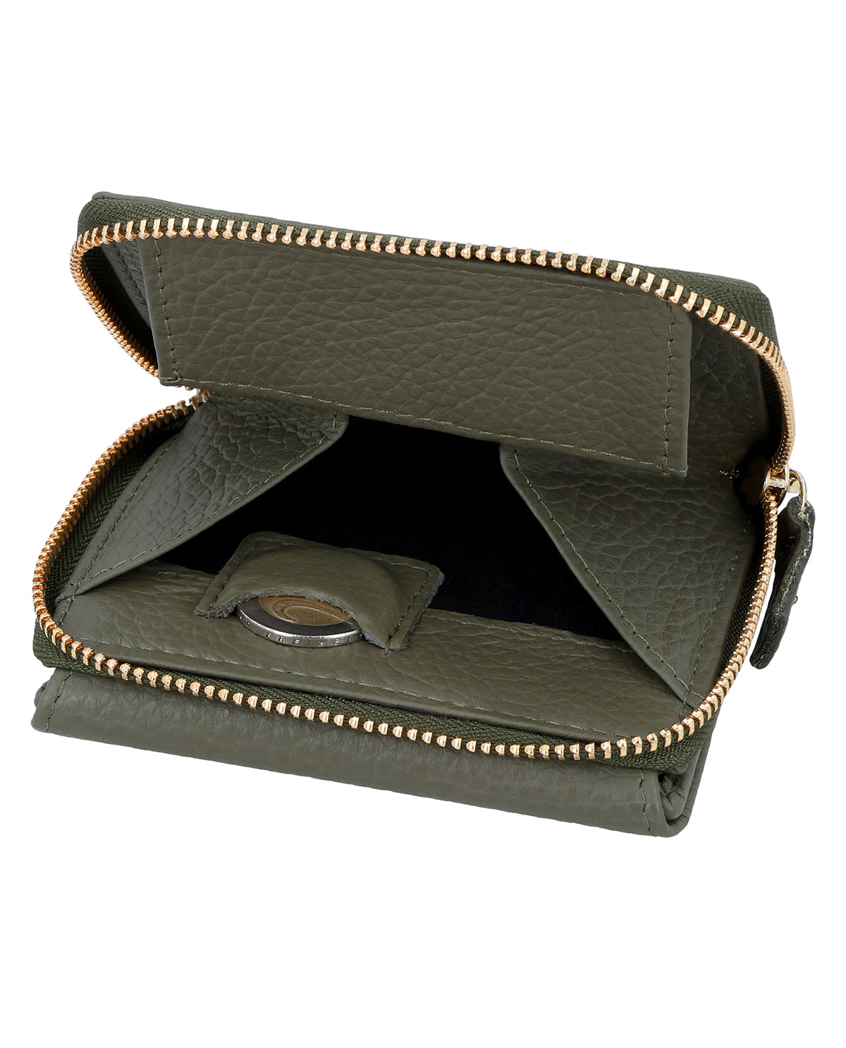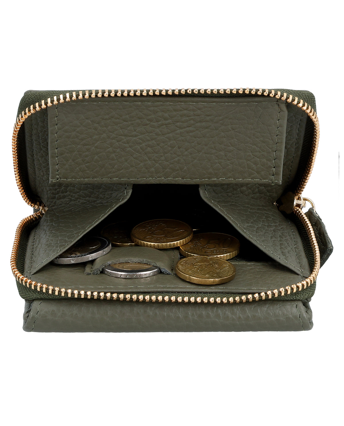 Inside, "Brigitta" has a bill compartment, a fold-out window, space for up to 6 cards, and a separate coin compartment that closes with a zipper. The coin compartment also has an extra slot for a 1-euro coin, ideal for shopping carts or lockers. This prevents anything from tumbling into your bag. Made from high-quality cowhide leather, the wallet closes with a snap fastener. Pop it in your bag – you're ready to go with the "Brigitta" wallet!
